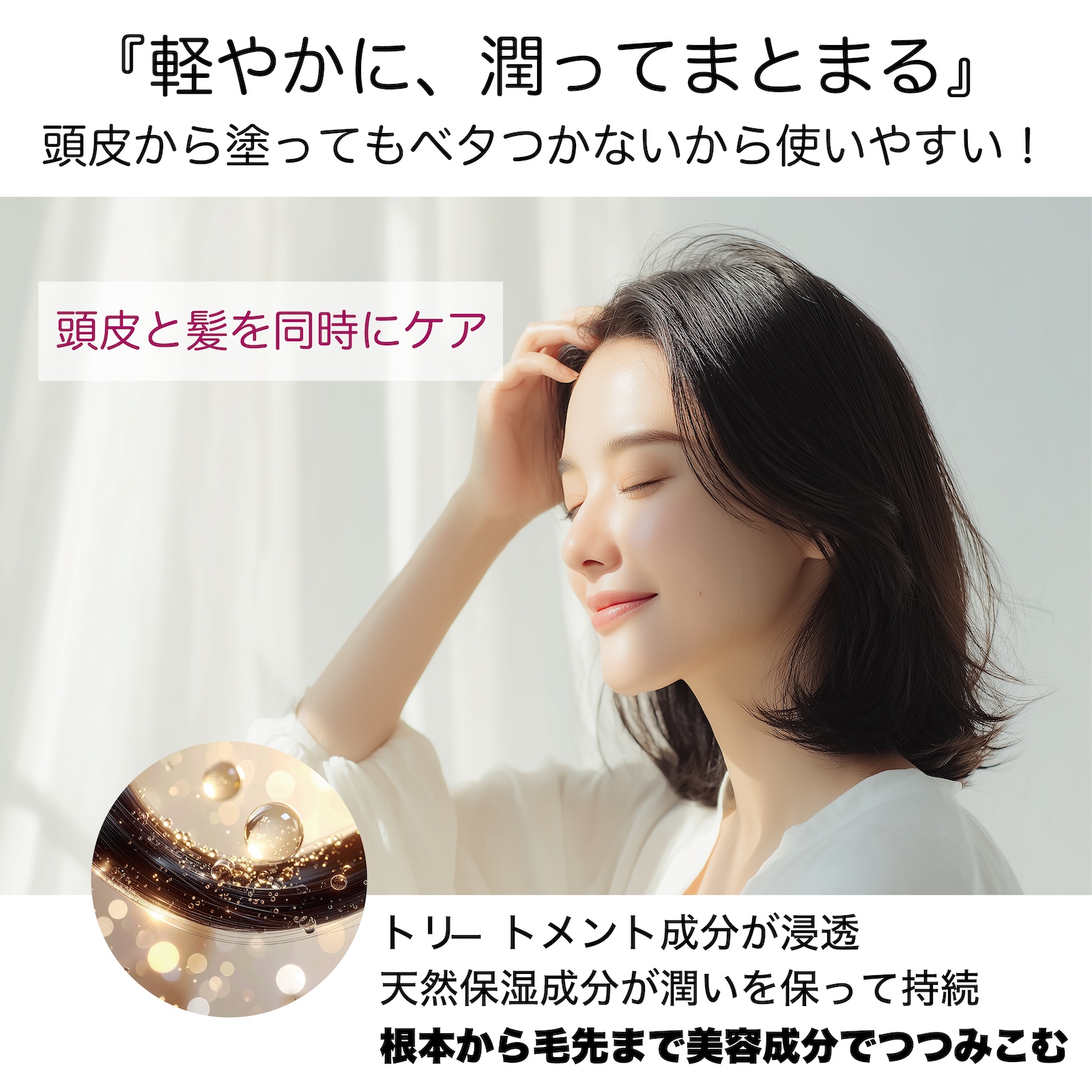 頭皮に直接使える処方で、根元から潤いと栄養を補給。健やかな髪が育つ土台を整えます。