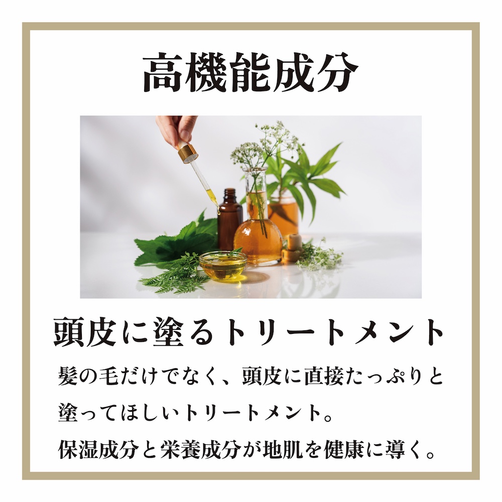 このトリートメントは、頭皮に直接塗ることで、バリア機能を高め、潤いをしっかりと与えることができるアイテムです。乾燥による頭皮のダメージをケアし、頭皮の健康をサポートすることで、毎日の髪の悩みから解放され、コンプレックスの改善を実感できます。
