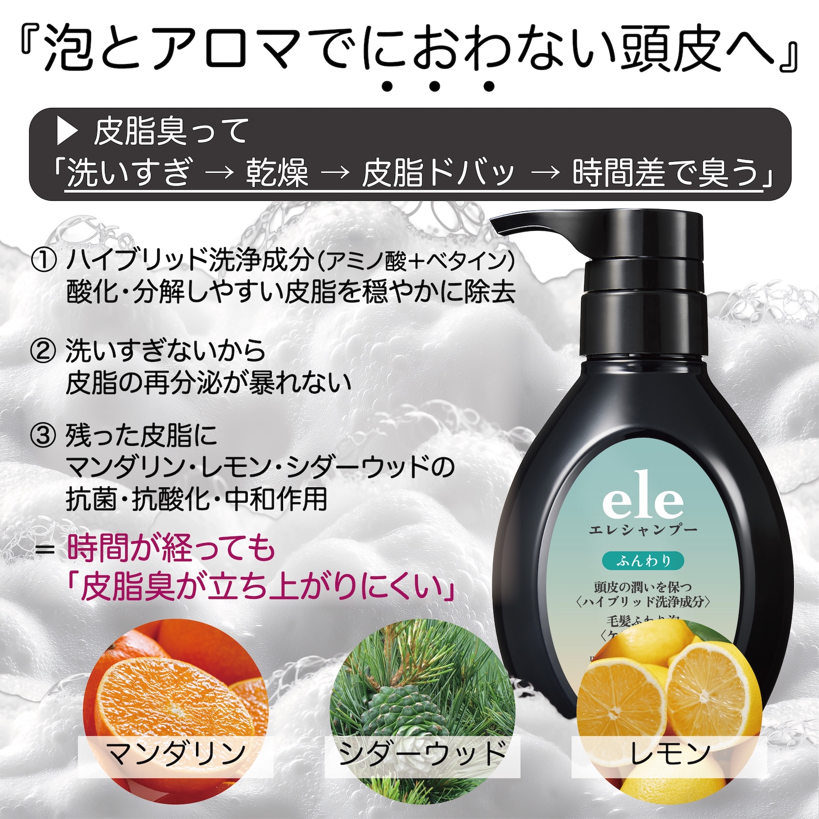 マンダリン・レモン・シダーウッドを基調としたアロマが、皮脂の酸化や菌バランスにアプローチし、