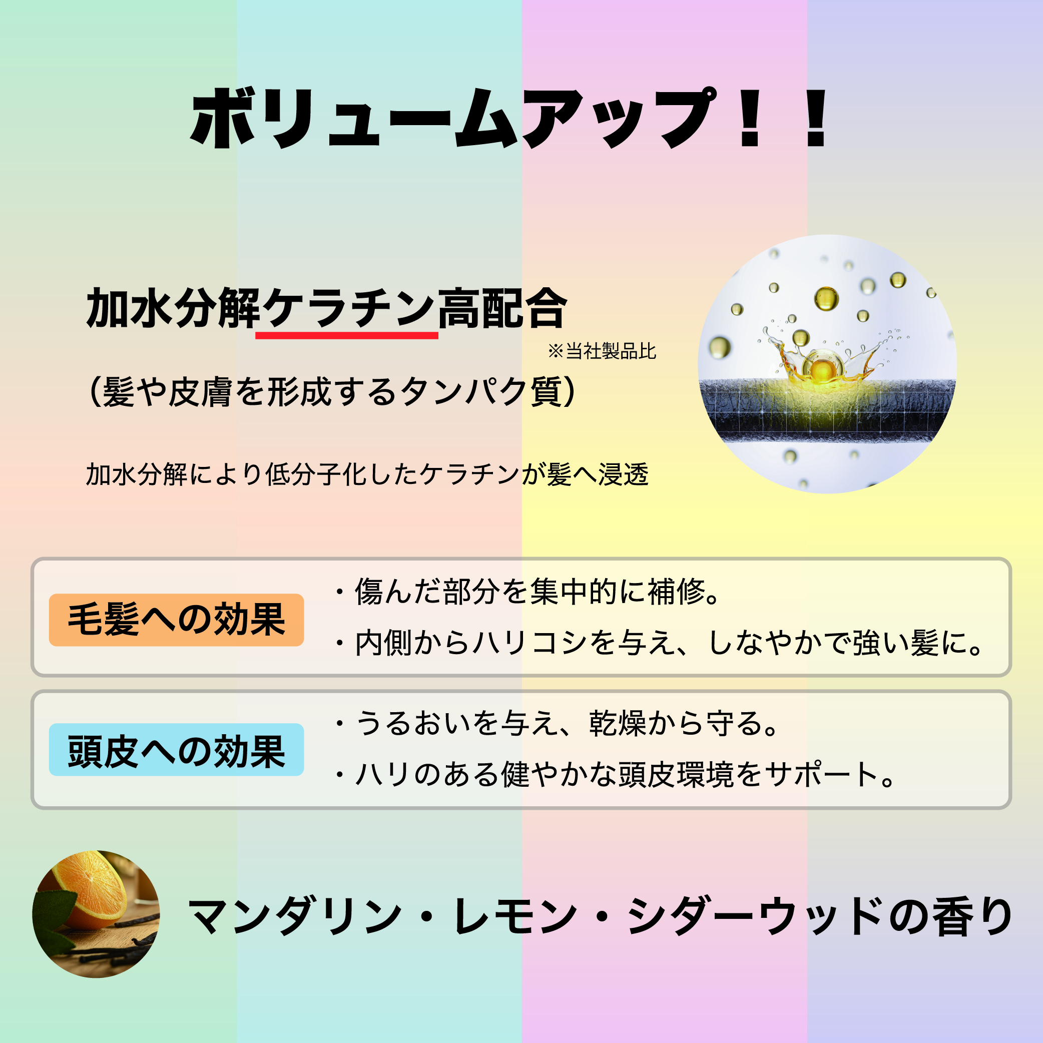 加水分解ケラチンを高配合し、ハリ・ツヤ・ボリュームをあたえます。